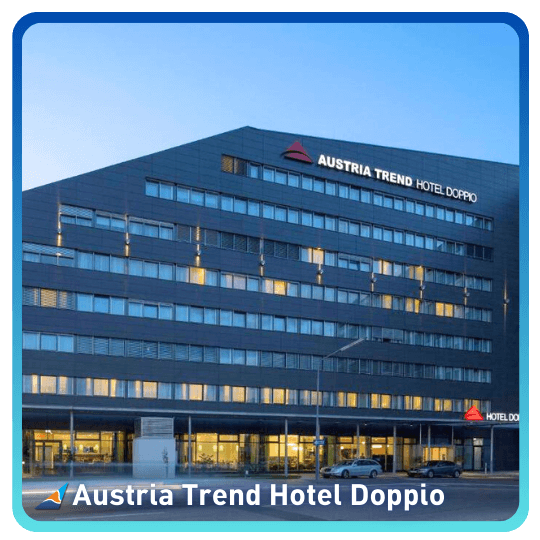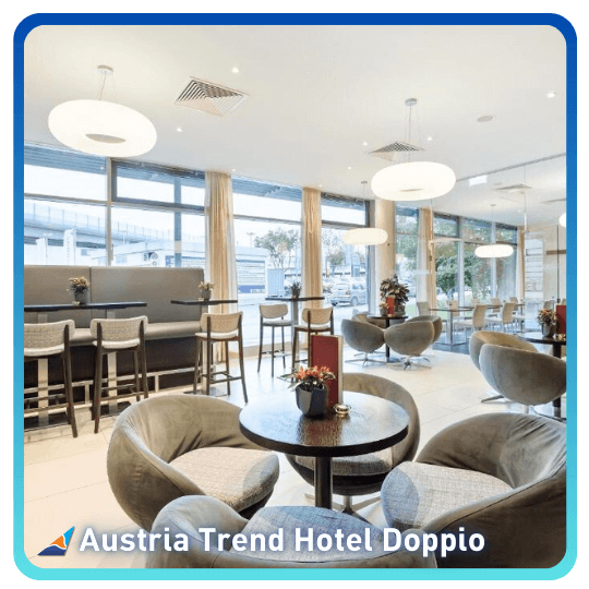 Σε μια εξαιρετική τοποθεσία μέσα στο εντυπωσιακό T-Center, σύμβολο της σύγχρονης αρχιτεκτονικής της Βιέννης, βρίσκεται το Doppio Hotel. Ο πρωτοποριακός σχεδιασμός του έχει αποσπάσει πολλούς επαίνους και βραβεία, ανάμεσά τους και το Βραβείο Αστικής Αρχιτεκτονικής Otto Wagner. Η τοποθεσία του ξενοδοχείου είναι ιδιαίτερα προνομιακή, μόλις 7 λεπτά από τη στάση του μετρό και 3 λεπτά από τη στάση του τραμ, προσφέροντας εύκολη πρόσβαση στο κέντρο της πόλης και στα σημαντικότερα αξιοθέατα. Το ξενοδοχείο διαθέτει 143 κομψά και λειτουργικά δωμάτια, όλα εξοπλισμένα με αυτόνομο κλιματισμό, δωρεάν Wi-Fi και θύρα LAN. Επιπλέον, κάθε δωμάτιο περιλαμβάνει χρηματοκιβώτιο για φορητό υπολογιστή με ενσωματωμένη παροχή ρεύματος, προσφέροντας ασφάλεια και άνεση για κάθε επισκέπτη.