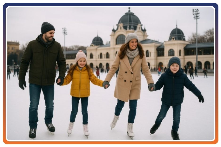 Πατινάζ στον Πάγο Η δημοφιλέστερη επιλογή είναι η εντυπωσιακή παγοπίστα του Városliget, μία από τις μεγαλύτερες και παλαιότερες υπαίθριες πίστες πατινάζ στην Ευρώπη. Απλωμένη μπροστά από το παραμυθένιο Κάστρο Vajdahunyad, προσφέρει ένα σκηνικό που μοιάζει βγαλμένο από χριστουγεννιάτικη καρτ ποστάλ. Οι επισκέπτες, από αρχάριους έως έμπειρους skaters, απολαμβάνουν έναν τεράστιο, άνετο χώρο για να γλιστρήσουν στον πάγο, ενώ ο ζεστός φωτισμός, η μουσική και η εορταστική ατμόσφαιρα δημιουργούν μια μοναδική αίσθηση χαράς. Γύρω από την πίστα υπάρχουν σημεία για ζεστή σοκολάτα ή vin chaud, κάνοντας την εμπειρία ακόμη πιο απολαυστική.