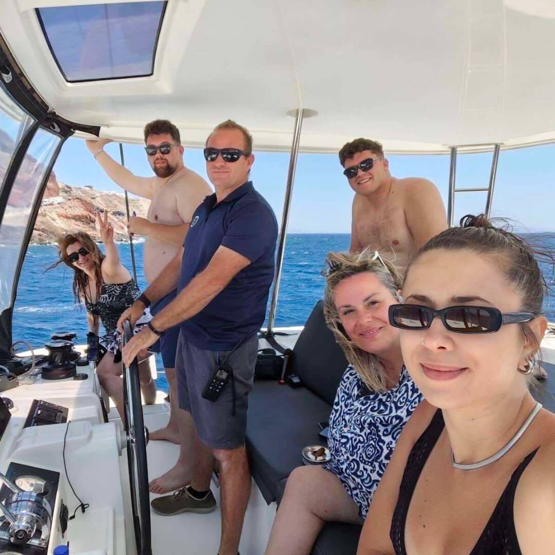 Ένα ακόμα highlight του ταξιδιού ήταν η εμπειρία με το Caldera Yachting Santorini: μια βόλτα με καταμαράν στα καταγάλανα νερά του Αιγαίου. Η αίσθηση του να ταξιδεύεις δίπλα στα απότομα βράχια της Καλντέρας, με τον ήλιο να δύει στον ορίζοντα, ήταν πραγματικά μαγική και θα μείνει χαραγμένη στη μνήμη μας.
